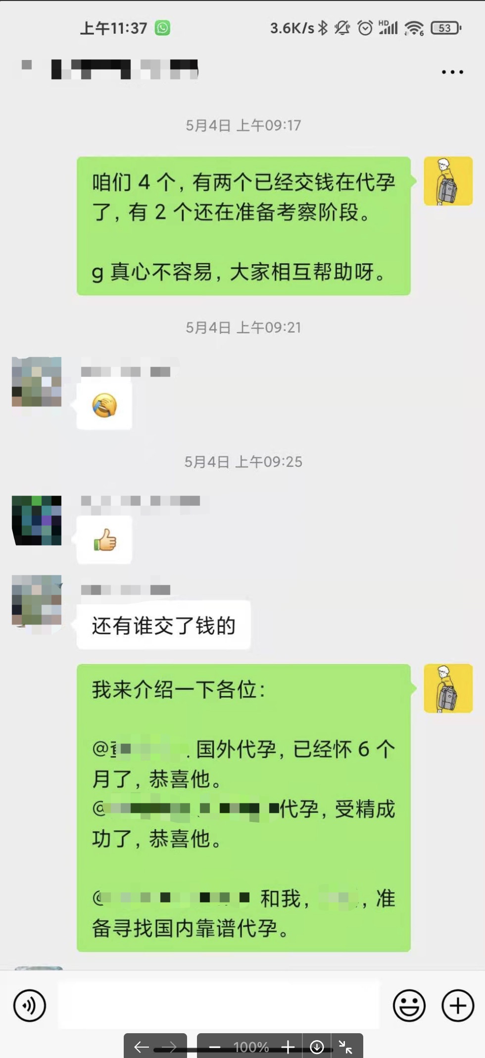 在知乎上确认了代孕是真的可行之后,我疯狂的搜索相关信息。甚至,想到了在 QQ 群搜索代孕字眼找到 QQ 群。很遗憾,QQ 群同样被和谐的啥也没有。除了我找到了一个多囊群之外,啥也没有。就是在这个群,我发现了一个哥们,他 36 了,唯一的儿子得了一场病,虽然治好了,但是傻了,而他老婆已经不能再生了。那一刻,我发自内心的觉得,直男有时候可以比 Gay 还惨。也是在这个群里,我还知道了一个哥们,结婚了好多年,因为女方不能产卵不育。也认识了一个女的,结婚了十多年,因为她自己的原因不孕不育,但是她老公对她一直很好,而且很馋她身子。同时,在这个群里,也认识了好几个私人代孕的女人,每个人都说自己丈夫如何渣,自己只能做私人代孕补贴家用。当然,我没法去考察是不是真的骗子。或者是骗子,或许是真的吧。