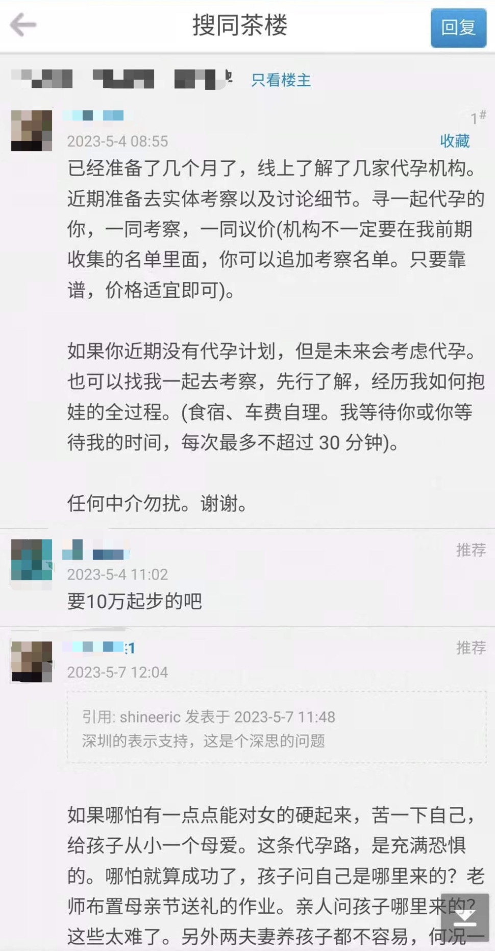 刚决定代孕的日子里,我充满了恐惧。我急切的想找一个做过的人问经验:这个到底是真的吗?真的有人愿意帮我代吗?真的有机构敢违法做这个事情,而不是只收钱不办事?我真的从来没有听到过见到过看到过谁的孩子是代来的。要确认这些,我第一件事情就是想到在搜同上搜索代孕关键字,但是信息真的好少。紧接着,我又在我加入的各大电报色群发信息,结果可想而知,我被纷纷踢出群。除了搜同和电报,我也尝试过去推特搜索信息,奈何全部是广告!根本搜索不到有用的信息。